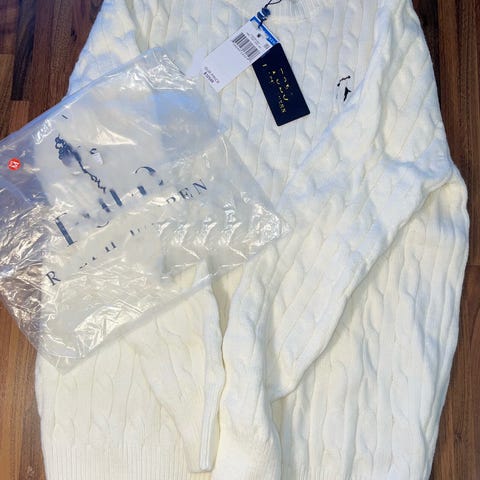 Kuvien Ralph Lauren beige neulepusero. Kokolappu on lähtenyt irti, mutta koko on M. Tosi hyvässä kunnossa. Postitus onnistuu.