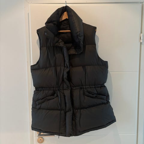 Tummansininen (melkein musta) paksu peak performance untuvaliivi. Koko M mutta enemmän kuin S.