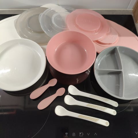 Myydään tarpeettomana setti ruokailuun liittyviä tarvikkeita. Joukossa käyttämättömiä ja vähän käytettyjä, osa ollut käytössä enemmänkin. Sisältää mm. kertaalleen testatun taikamukin, käyttämättömiä nokkamukeja, maistelututin, lusikoita, ruokalappuja ym.