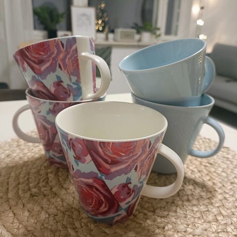 Iittala / Arabia KoKo kahvimukit, yhteensä 5 kappaletta: 2 vaaleansinistä ja kolme ruusukuosilla. Koko setti 12€, yksittäin ostettuna 3€/muki.