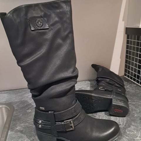 Loistokuntoiset Rieker lämminvuoriset talvisaappaat koko 38. Päälllinen RiekerTEX käsitelty. Voidaan käyttää suoravartisina tai vuori käännettynä. Korko 4,5cm, varren pituus kantapäästä 32cm. Alkuperäispakkauksessa.