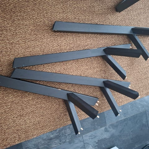 Paksua lankkua, puuöljy pinnassa. Metallijalat säätömuttereilla. Tukeva. Tuolit eivät myynnissä.