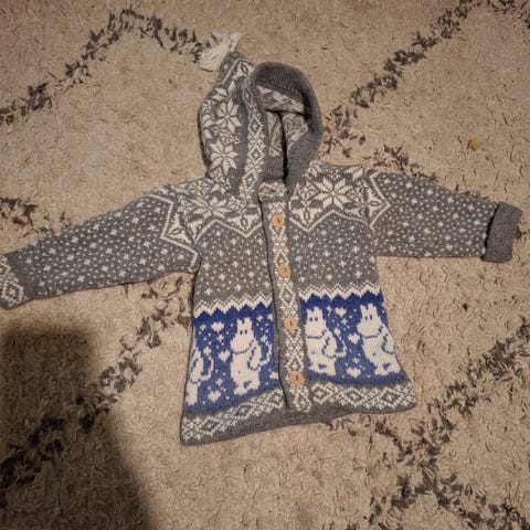 Myydään vähän käytetty 100% villapuku - neule hupulla ja housut. Villapuku on vaalea harmailla kuvioilla. Löytyy tähti- ja sydänkuvioita sekä Muumipeikon näköinen hahmo. Villapuku voidaan pestä koneessa 30 asteessa. Villapuvun koko on ehkä n 68? Kuvissa löytyy mitat koska puvussa ei ole kokomerkintää enkä muista minkäkokoinen meidän pienokainen oli kun hän käytti tämän muutaman kerran.