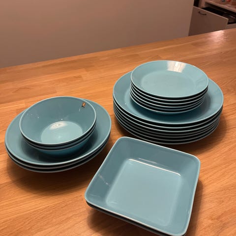Iittala astiasto sisältää useita sinisiä lautasia ja kulhoja. Astiaston materiaalina on posliini. Sopii käyttöön keittiössä ja ruokailuun.