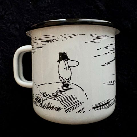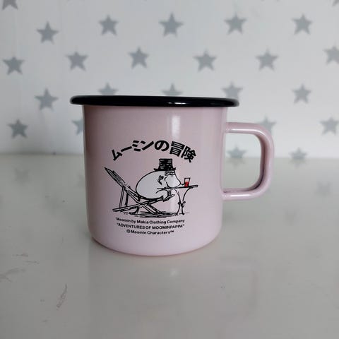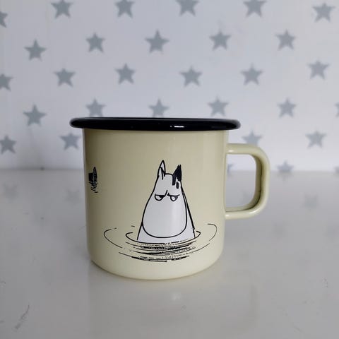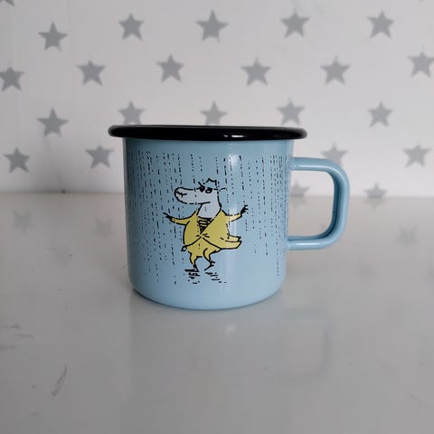 Makian ja kummelin collabista sinisellä taustalla oleva kahvikuppi myyntiin. Niinkuin näkyy ei ole käytetty ja kuplamuoveissa pidetty.