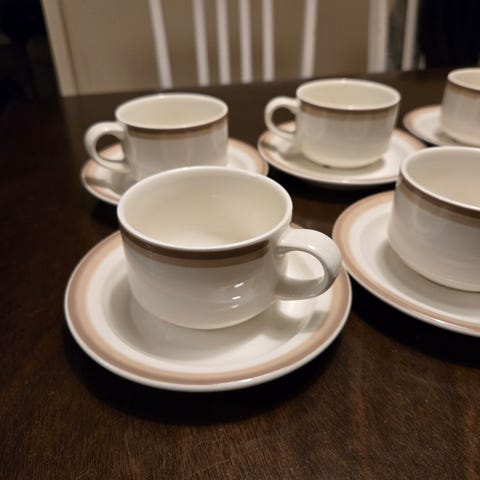Syviä lautasia 9 kpl ja 10 kpl ruokalautasia. Ei halkeemia, mutta käytön jälkiä on.