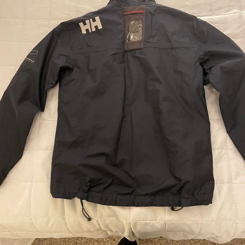 Helly Hansen takki, valkoinen, koko s. Kuvissa näkyy, minkä verran pinttynyttä likaa. Ei ole koitettu puhdistaa kuin pesukoneessa tavallisella pyykinpesuaineella.