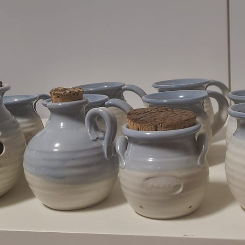 Kerman saven astiaston kermakko ja sokerikko, ruskeavalkoiset, keraamiset keittiöastiat. Sopivat käyttöön keittiössä maidon ja sokerin tarjoiluun.
