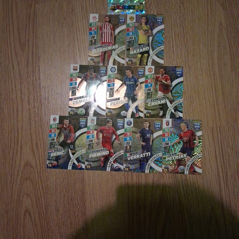 FIFA 365 jalkapallokortit, sisältäen Cristiano Ronaldon ja muita tunnettuja pelaajia. Kortit esittävät pelaajien kuvia, nimiä ja tilastotietoja. Soveltuvat keräilyyn ja pelaamiseen.
