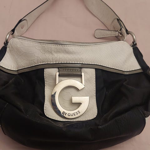 Guessin vaaleankeltainen syötävän söpö pikkulaukku. Vetoketju, sisällä taskuja. Korkeus n. 11cm, syvyys n. 6.5cm ja leveys n. 18cm. Hyvä kunto, kuvassa hihnan päällä minimaalista punertavaa värjäymää ja toisessa kuvassa hihnan alapuolella pari painaumaa ja punerrusta. Metallilogosta hieman valkoista pois s-kirjaimen yläkulmasta. Muuten ei vikaa! 80% polyesteriä ja 20% puuvillaa sisus, päällys polyuretaania, jos tulkitsin lappua oikein.