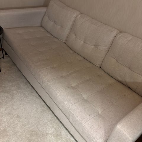 Kohtuu hyvässä kunnossa oleva kangas sohva. Päällä pölyä, imuroin ennen noutoa. Ahtaan paikan takia kuvia en saanut enempää. Kissa vähän kynsinyt reunasta, mutta ei pahasti. Tästä koitan vielä saada kuvaa erikseen myöhemmin. Eläintalous. Mukaan halutessaan ainakin kuvassa näkyvä tyyny. Toinen mukaan, jos löytyy.