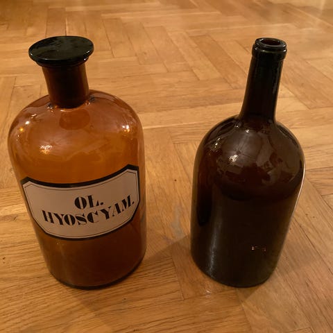 6 kappaletta vanhoja lasipulloja, joissa kartio malliset korkit. Mitat pienimmän pullon korkeus 9cm. Kaksi samanlaista 14.5cm. seuraavan korkeus 18cm. toiseksi isoin 22cm. isoimman pullon korkeus 25cm.