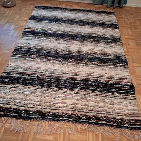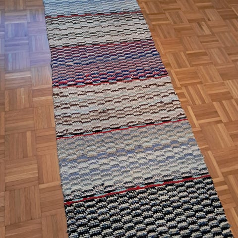 Itse kangaspuissa kudottu, värikäs, neljäniitinen räsymatto.