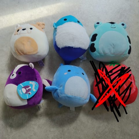 Myydään kuvasaa olevat 4kpl squishmallow pehmolelua (ollut hyllyssä koristeena). Pehmoleluista on leikattu pois muovinen koukku. (Katso toinen kuva)