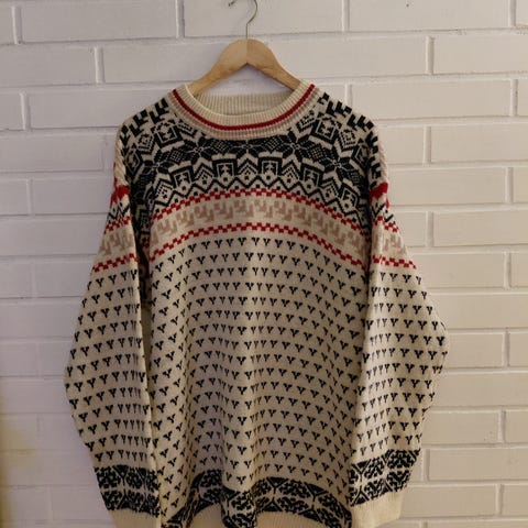 Lämmin kuvioneule-villapaita myydään itselle tarpeettomana. Siisti ja ehjä. 100 % villaa. Koko n. L-XL-XXL. Sopii myös miehelle.