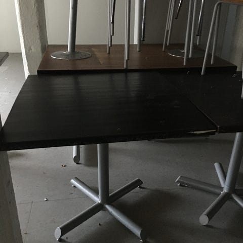 Musta pöytä, jossa on kaksi metallijalkaa. Pöydän kansi on suorakulmainen ja valmistettu materiaalista, joka muistuttaa puuta tai laminaattia. Pöydän jalat ovat pyöreät ja mustat, ja ne antavat pöydälle vakautta. Mitat: 120*70 cm, korkeus 74 cm. Hinta on yhdelle pöydälle.