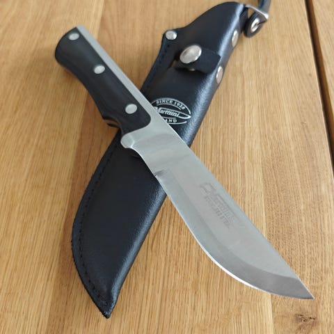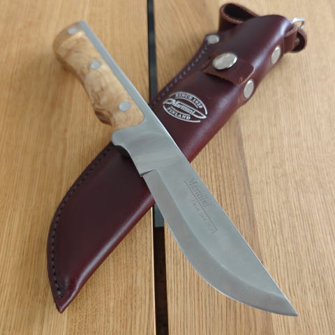 Käytetty, mutta hyväkuntoinen marttiini jossa perinteistä skandinavialaista kuviota tupessa, puukon terässä leima