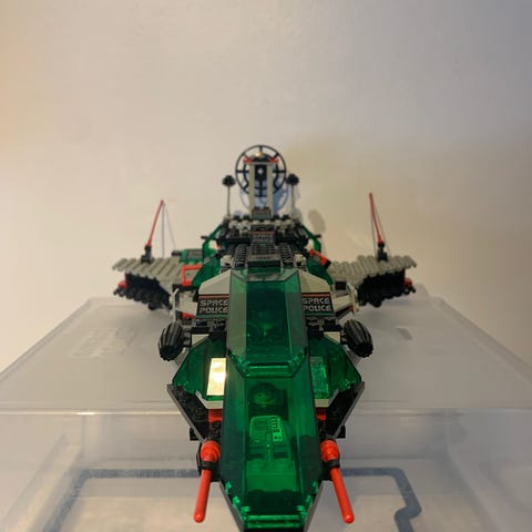 LEGO Space Police avaruusalus, jossa on sinisiä ja mustia osia sekä punaiset läpinäkyvät osat. Sopii LEGO-rakentamiseen ja teemaan Space Police. Keräily Lego 80- luvulta. Valitettavasti ohje ei ole enää tallessa niin suosittelen hakua.