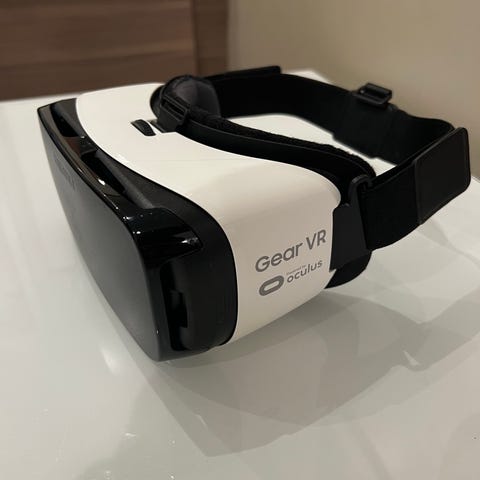Samsung Gear VR virtuaalitodellisuuslasit valkoisella ja mustalla värillä. Laite on suunniteltu käytettäväksi virtuaalitodellisuussovelluksissa ja peleissä, ja se toimii Oculus-alustalla.