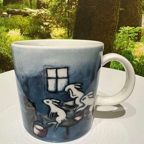 Arabian Heljä Liukko-Sundströmin suunnittelema Rakas sauna -pupumuki. Mukissa puput saunovat ja uivat.