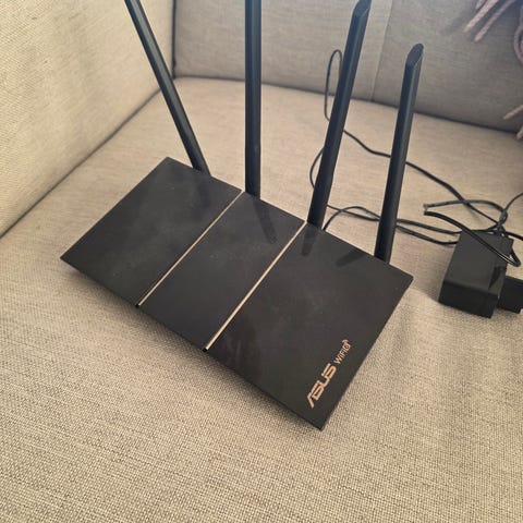 Asus RT-AX58U reititin, joka tukee Dual Band Wi-Fi -yhteyttä. Laiteessa on neljä ethernet porttia ja yksi Wan portti.