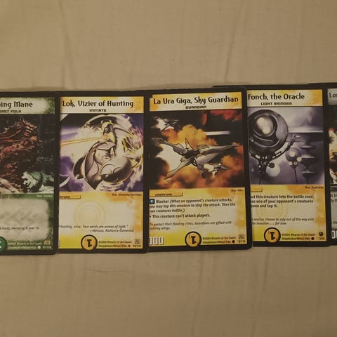 Duel Masters keräilykortit, sisältäen kortit Transmogrify, ikas the Spydroid ja Bombazar Dragon of destiny. Korttien kuvat ja tekstit näkyvissä, käytettyjä.