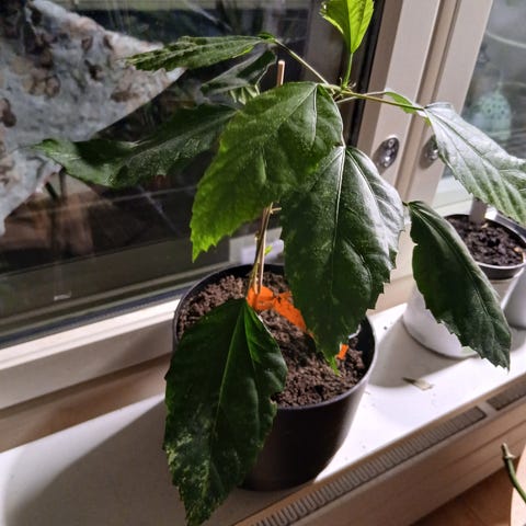 Kiinanruusu variegata 'Snow Queen'. Korkeus n. 52 cm, aloitin kasvattamaan tästä rungollista. Tuettu puutikuilla suoraksi ja tarvitsee edelleen tuennan. Yrittää parhaillaan haarautua joten pensasmallisenkin saa halutessaan. Lehdillä pölyä. Ruukku jää itselleni. Nouto Turku Halinen.