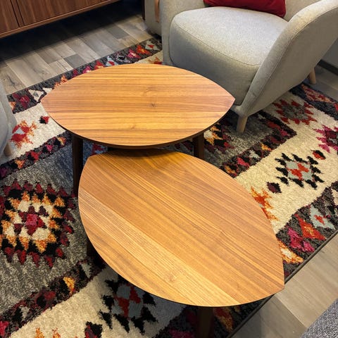 Kolmeosainen Juvako pesäpöytäsarja, valmistettu tummasta puusta. Pöydät ovat pinottavia, mikä tekee niistä käytännöllisiä pieniin tiloihin. Jokaisessa pöydässä on koristeelliset, kierretyt jalat, jotka tuovat lisää visuaalista kiinnostavuutta.