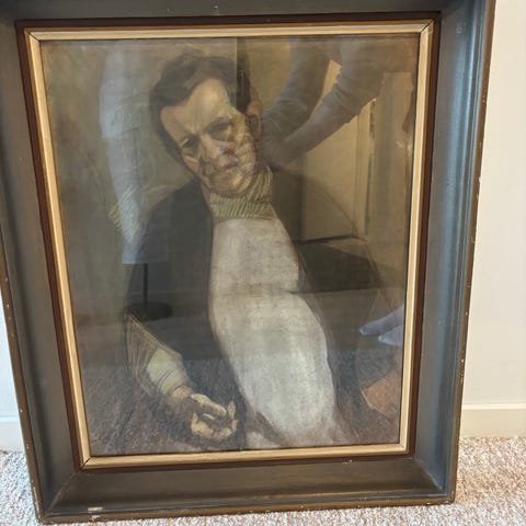 Kehyksessä on hieman kulumaa, mutta itse piirustus on säilynyt hyvässä kunnossa. Paperin väri on hieman kellastunut ajan myötä, mikä on tyypillistä vanhemmille teoksille.