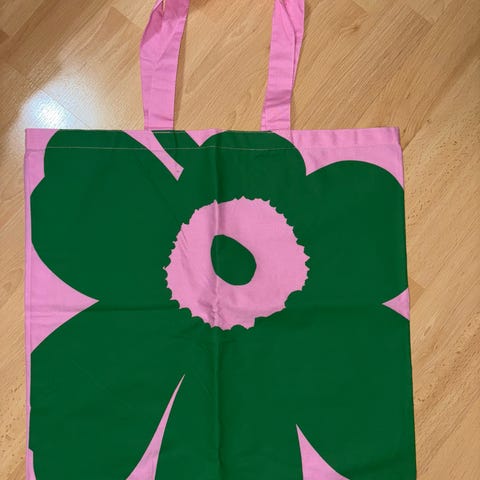Marimekko 60th anniversary juhlavuoden logikassi, käyttämätön. Väreinä keltainen ja ruskea joka taittaa viininpunaiseen. Luomupuuvillaa.