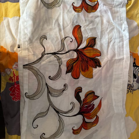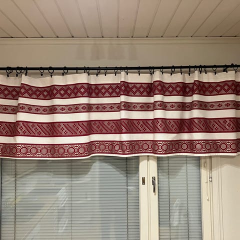 Punainen tiikerinmarja-kappaverho, yläosassa näkyy rypyt tangolla olemisesta, todennäköisesti siliää silittämällä, muuten ei mitään huomautettavaa.