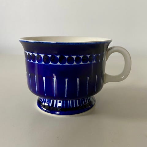 Arabia Valencia kahvikuppi, kupin korkeus 6 cm, halkaisija 8 cm ja asetti 11,5 cm. Suunnittelija Ulla Procope.