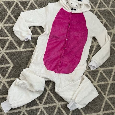 Care Bears naisten haalari, koko M, valmistettu pehmeästä materiaalista. Haalarissa on pinkki väri ja etuosassa sateenkaari-kuvio. Mukana hupussa Care Bears -hahmon kasvot ja korvat. Täydellinen penkkariasu, on väljä joten puvun alle mahtuu hyvin lämmintä vaatetta