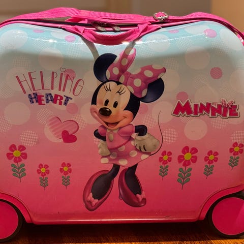 Trunki Lasten matkalaukku missä voi istua ja on pyörät.
