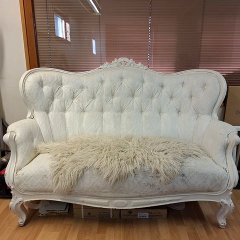 Siistikuntoinen, ehjä ja tuoksuton pikkusohva historian hämäristä, ehkä n. 1900-luvun alkuvuosilta - voi olla reilusti vanhempikin. Kunnostettu kymmenisen vuotta sitten, edelleen ehjä, puhdas, tukeva ja käyttövalmis. Verhoilukangas alkuperäisen kaltainen. Pystyhkö selkänoja, ei siis mikään löhösohva, mutta ihan asiallinen oman aikansa edustaja kuitenkin. Leveys 145 cm, selkänojan korkeus 93 cm, istumakorkeus 45 cm, syvyys 75 cm, paino n. 25 kg. Kotiinkuljetus järjestyy samaan hintaan Tampereella ja naapurikunnissa, kauemmaksikin polttoainekuluja vastaan. Kysy!