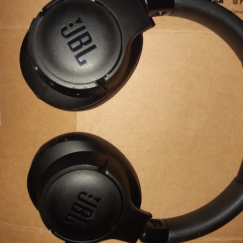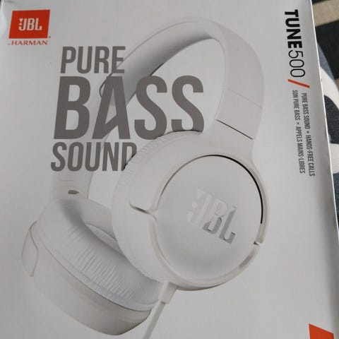 JBL kuulokkeet valkoisella värillä. Kuulokkeissa on pehmustetut korvatyynyt ja säädettävä panta. Käytössä näkyy kulumaa ja käytön jälkiä erityisesti korvatyynyissä ja pannassa.