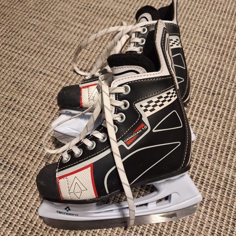 CCM -merkin hokkarit kokoa 30, pohjallisen sisäpituus n. 19 cm. Toisen luistimen körjen kangas kulunut rikki.