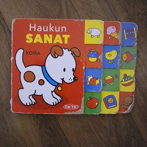 Myydään rakastettu ja paljon luettu Haukun sanat - kuvakirja. Paksut jämäkät sivut pienelle lukijalle.