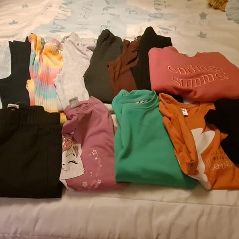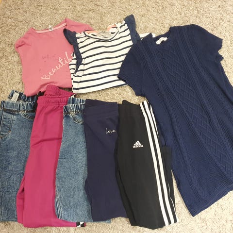 Adidaksen vaatepaketti, jota käytetty koossa 134cm(140cm). Kokomerkinnät saattavat olla isompia, koska Adidas on yleisesti aika pientä kokoa.