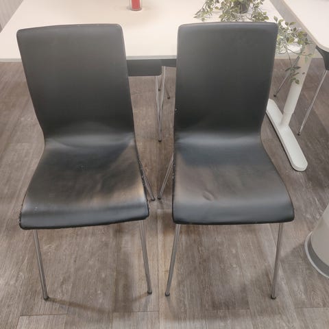 Mustat puurunkoiset, tekonahkapäällysteiset tuolit. Neljä kappaletta. Kaksi tuoleista siistejä, kahdessa kuvanmukaista jälkeä. Ehjät ja hyvät tuolit muuten.