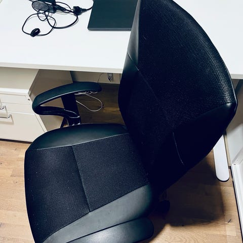 Istuimessa, selkänojassa musta kangasverhoilu. Niskatuki mustaa nahkaa, hyvä kuntoinen.