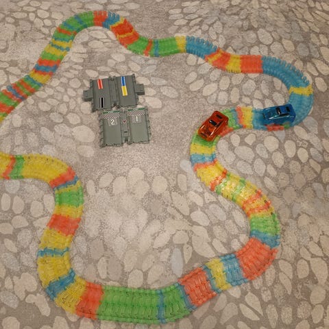 Myydään uutena ostettu ja pari kertaa ajettu autorata. Rata toimii, mutta on haastava ajettava: jos painaa liian vähän kaasua, auto ei liiku ja jos painaa liikaa kaasua, auto lentää pois radalta. Yksi kiinnike on poikki (katso vika kuva), mutta kolme ehjää kiinnikettä pitää radan osat silti tiukasti yhdessä. Neljä isoa D-paristoa kuuluu kauppaan. Ovh 64e + paristot 7e. Eli tästä lähtisi autorata paristojen hinnalla!