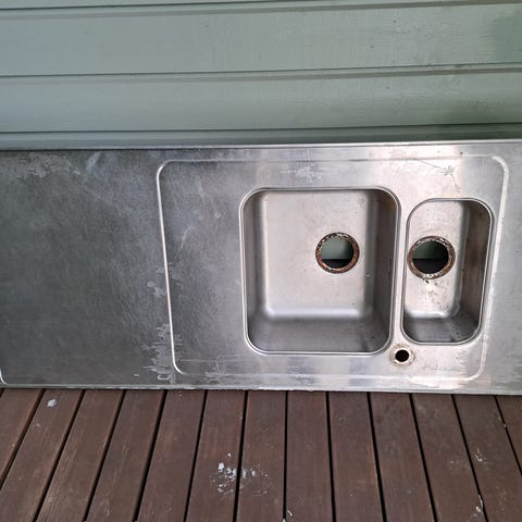 Rst-pöytä jossa kaksi syvää allasta. Vaatii hieman fiksausta, riippuen mihin käyttöön tulossa.