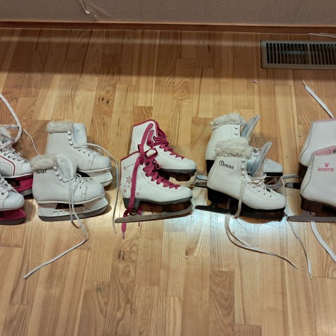 Luistinten pinnassa muutama kolhu ja tummentuma, kuitenkin hyvin siistit luistimet. Ei teroitettu.