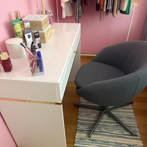 Myydään hyväkuntoinen, valmis setti johon kuuluu meikkauspöytä, tuoli ja kärry. Kaikki tuotteet on ostettu Jyskistä ja ovat hyväkuntoisia.