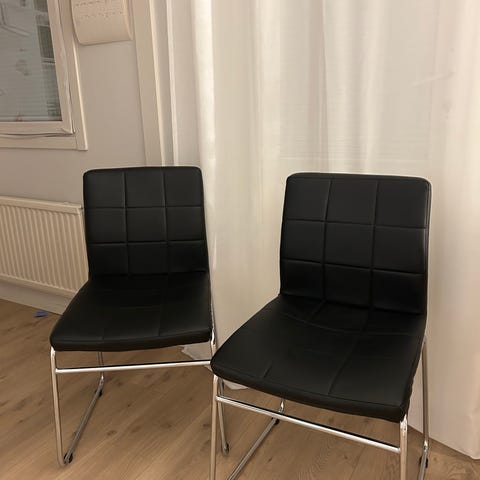 Pehmustetut ruokapöydän tuolit. Tuolit vaativat uudelleen verhoilun sillä tekonahka on kulunut. Tuolien puun värinen runko ja pehmusteet edelleen hyvässä kunnossa. Ostettu Askosta 2020. Kaikki kuusi tuolia myydään samalla kerralla ensimmäiselle hakijalle yhteishintaan 60€