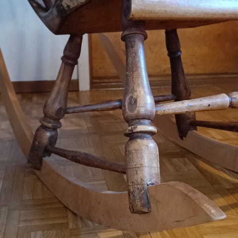 Vanha hyväkuntoinen keinutuoli seuraavaan kotiin. Toki pientä kulumaa paikoitellen puuosissa, mutta yleisilme on siisti.