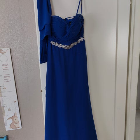 Ilta- tai juhlapuku satiinimateriaalista, väriltään violetti. Naisten koko 42. Mekossa on koristeellisia yksityiskohtia ja sivuhalkio. Sopii juhla- ja iltatilaisuuksiin. Helmasta löytyy tanssileveyttä. Saa tulla sovittamaan.