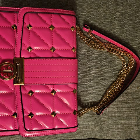 Pinkki pieni tekonahkainen laukku. Sisällä kukkakuvioinen kangas, kahdella lokerolla. Olkahihnassa pieni halkeama, siitä kuva ilmoituksessa.