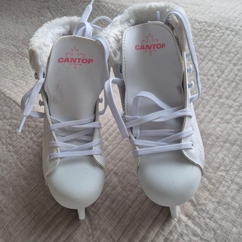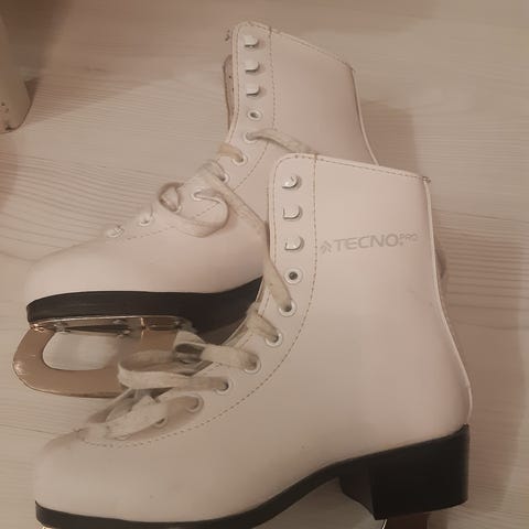 Spin kaunot koossa 32, valkoiset. Kärkien ulkopinta kulunut. Terotettu viime kaudella. Hyvät luistimet seuraavalle luistelijalle.